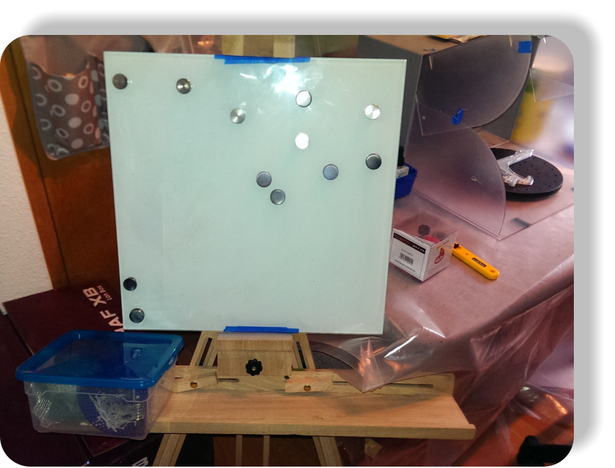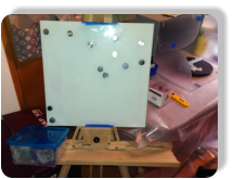 Hier meine Staffelei, wo ich die Arbeiten bis doppelt A3 ausführen kann. Dahinter die Absauganlagefür Spritz - Arbeiten. Wenn die Arbeiten einen Schutzlack benötigen, habe ich einen Profi Lackierer zur Hand, der gerade unter mir die Werkstatt hat.