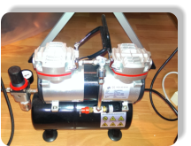 Für Airbrush, braucht es auch Luft,dies ist mein doppelzylinder Kompressor mit 3 Liter Lufttank.Für grössere Arbeiten, wird der Kompressor der Lackiererei benutzt.